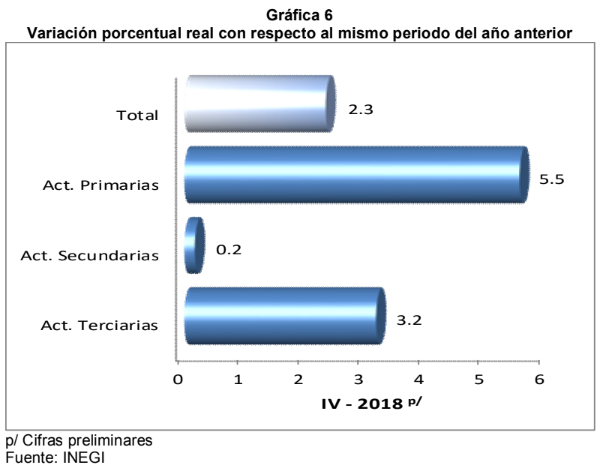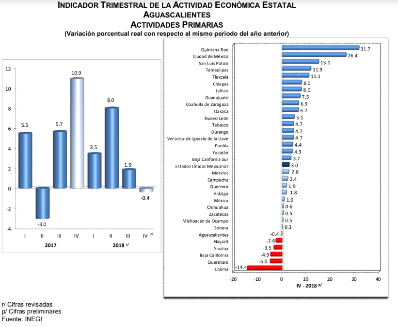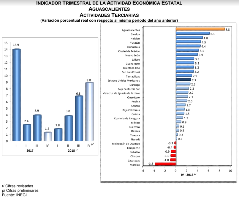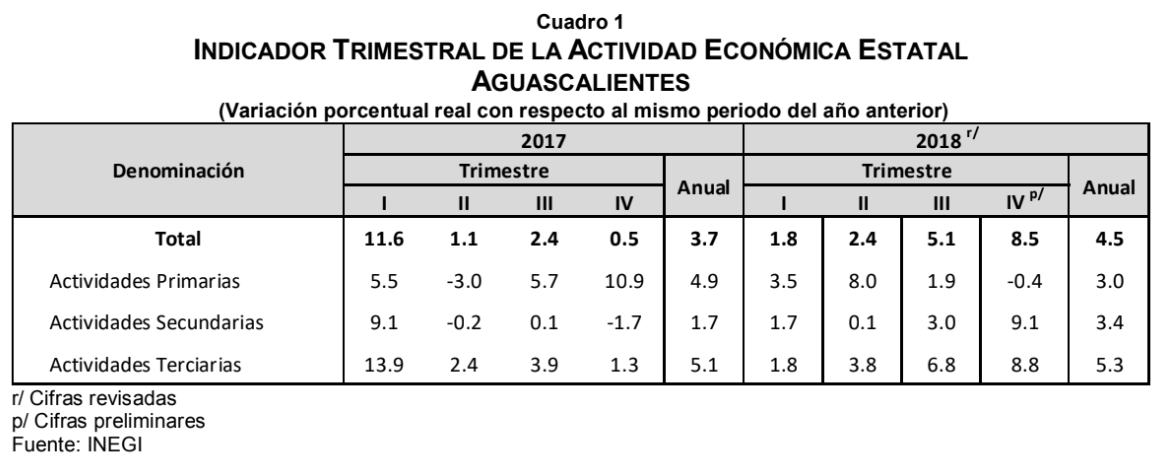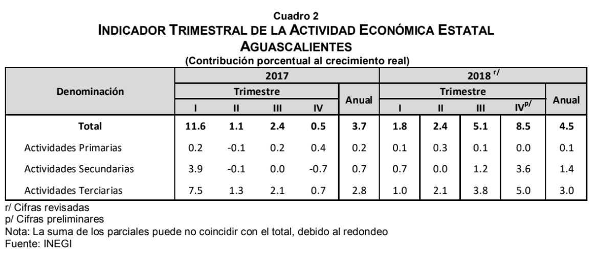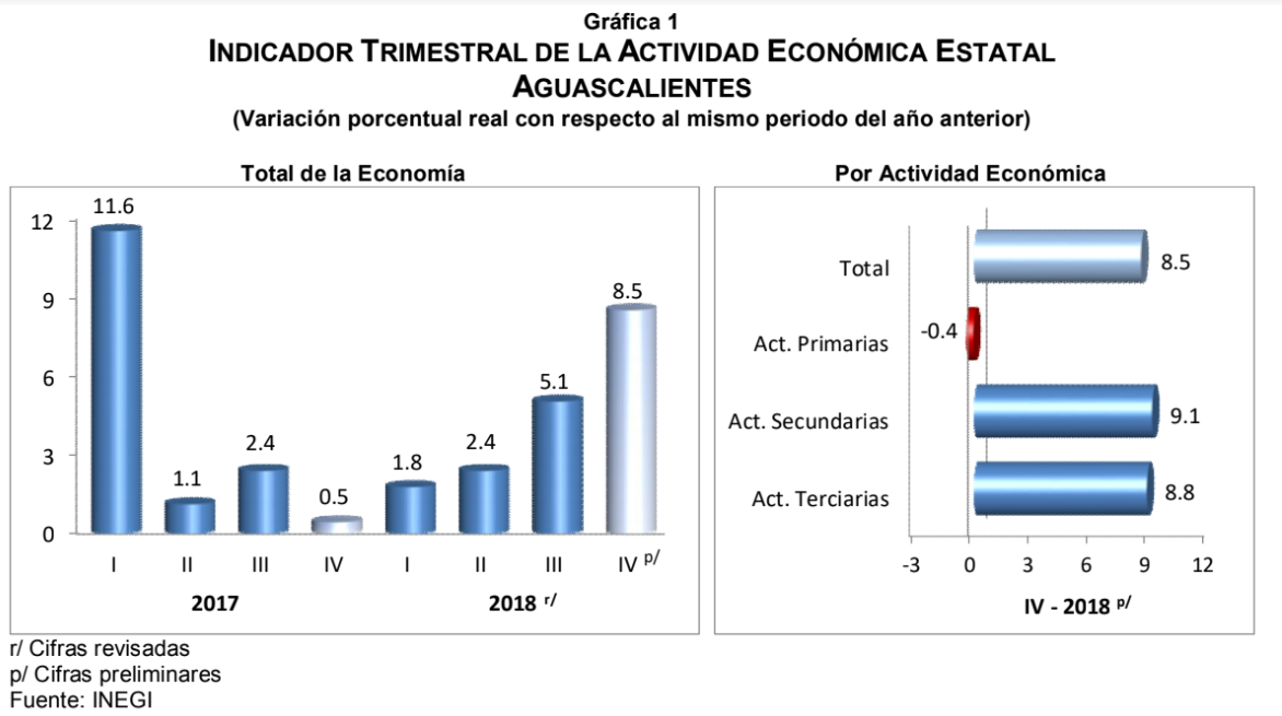 Aguascalientes mostró un incremento anual de 8.5% durante el cuarto trimestre de 2018, motivado por el comportamiento positivo de las Actividades Secundarias de 9.1%; y de las Actividades Terciarias de 8.8%; mientras que, las Actividades Primarias se contrajeron 0.4 por ciento.