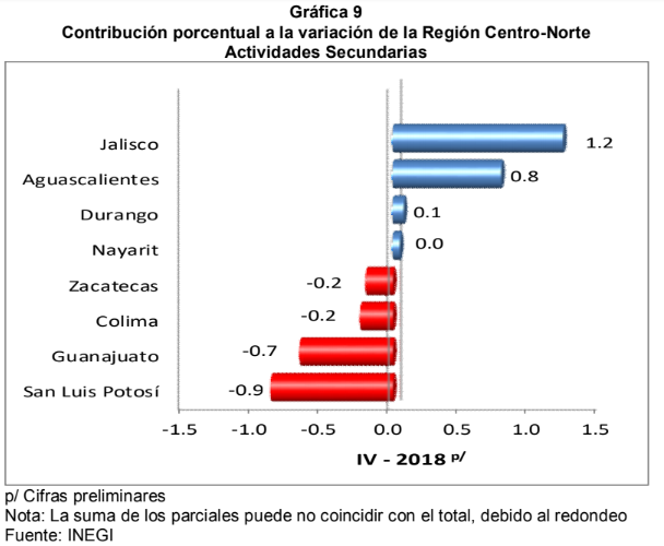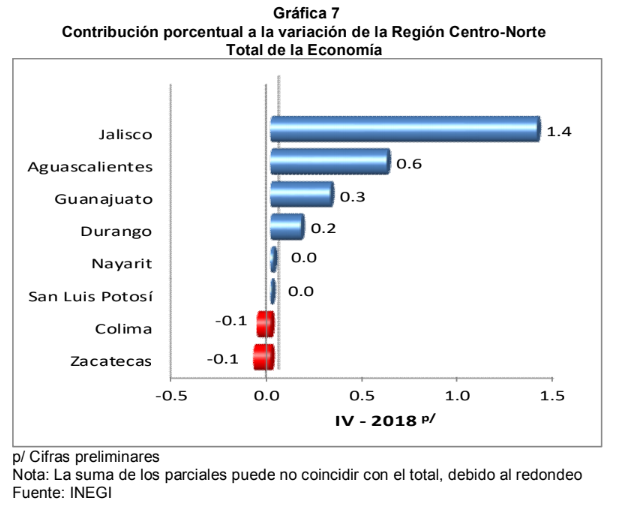 La entidad que más favoreció al crecimiento del total de la economía, en el cuarto trimestre de 2018, de la Región Centro-Norte fue Jalisco.