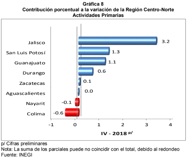 En las Actividades Primarias los estados de Jalisco, San Luis Potosí y Guanajuato fueron los que más aportaron al crecimiento de la región, en el trimestre de estudio.
