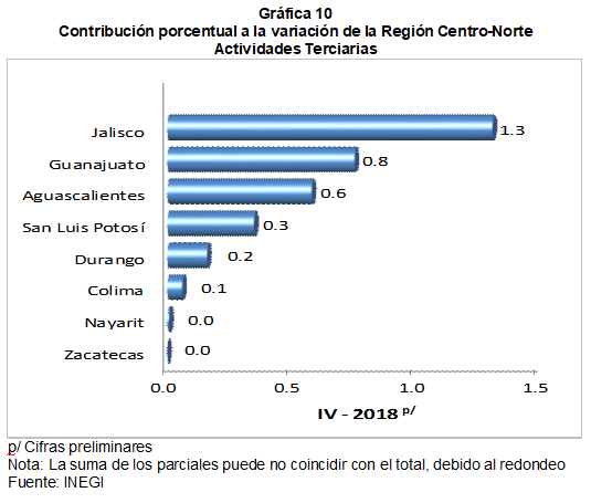 En las Actividades Terciarias todas las entidades que conforman la región tuvieron una contribución positiva, siendo Jalisco la que alcanzó una mayor participación.