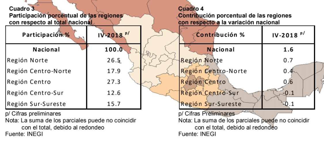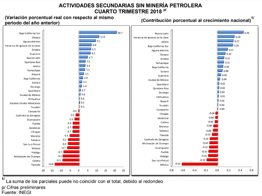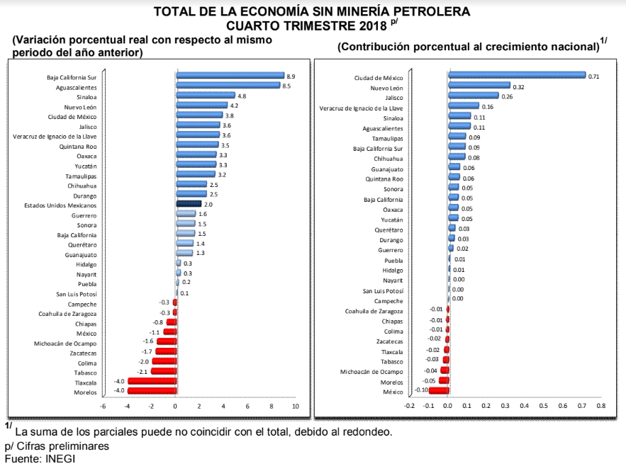 En el cuarto trimestre de 2018 la variación anual nacional del Total de la Economía alcanzó una evolución de 2%, quedando trece entidades por arriba de la media nacional, siendo Ciudad de México, Nuevo León y Jalisco, las entidades que más aportaron al crecimiento nacional.