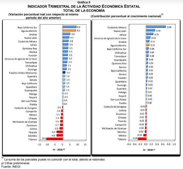 En el cuarto trimestre de 2018, Aguascalientes obtuvo la segunda posición del total de la economía, con respecto a las 32 entidades federativas; asimismo, presentó una aportación de 0.11 puntos porcentuales al crecimiento nacional, ubicándose en el lugar sexto de contribución.