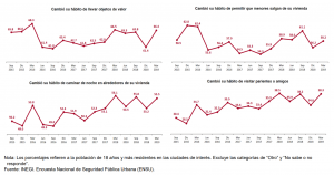 Los resultados del vigésimo tercero levantamiento de la ENSU revelan que, durante el primer trimestre de 2019, el porcentaje de la población que mencionó haber visto o escuchado conductas delictivas o antisociales en los alrededores de su vivienda fue: robos o asaltos (64.2%), consumo de alcohol en las calles (62.4%), vandalismo en las viviendas o negocios (50.1%), venta o consumo de drogas (42.8%), disparos frecuentes con armas (42.7%) y bandas violentas o pandillerismo (33.9 por ciento).
