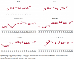 Entre los resultados de la ENSU, correspondientes a marzo de 2019, destaca que los porcentajes de población de 18 años y más que identificó a las diversas corporaciones policiales y que percibió su desempeño como “muy o algo efectivo” en sus labores para prevenir y combatir la delincuencia fueron: Marina (86.6%), Ejército (84.3%), Gendarmería Nacional (70.2%), Policía Federal (65%), Policía Estatal (49.5%), y Policía Preventiva Municipal (39.1 por ciento).