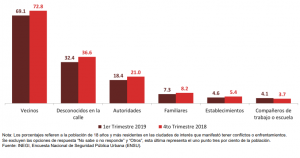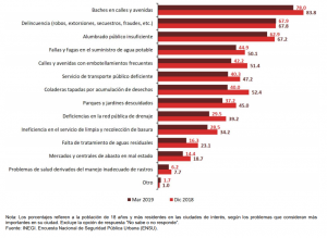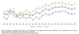 Respecto al primer trimestre de 2018, se presentó un aumento de 2.7 puntos porcentuales en cuanto a la atestiguación de disparos frecuentes; y una disminución de 3 puntos porcentuales en cuanto a consumo de alcohol; de 3.9 en vandalismo; y 2 puntos porcentuales respecto a bandas violentas o pandillerismo. Con respecto al cuarto trimestre de 2018 se presentó una disminución de 2.4 puntos porcentuales en consumo de alcohol en las calles; y 2.8 puntos porcentuales en atestiguación de venta o consumo de drogas en los alrededores de su vivienda.