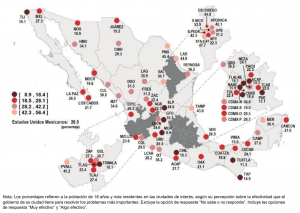 El porcentaje de la población de 18 años y más que consideró al gobierno de su ciudad como “muy o algo efectivo” para resolver los problemas más importantes fue 26.5% a nivel nacional. Las ciudades con mayor porcentaje en dicha percepción fueron: Mérida (56.4%), San Nicolás de los Garza (53.9%) y Saltillo (50.7%). Mientras que las ciudades con menor porcentaje de percepción de efectividad para resolver problemas fueron: Morelia (8.9%), Tuxtla Gutiérrez (11.3%) y Heroica Puebla de Zaragoza (13.1 por ciento).