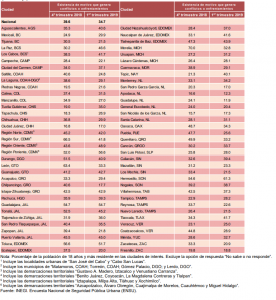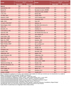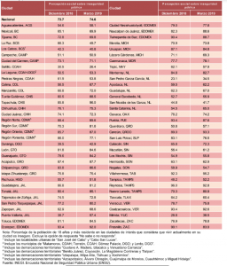A partir de 2016 se han generado estimaciones representativas por ciudad. En marzo de 2019 las ciudades con mayor porcentaje de personas de 18 años y más que consideraron que vivir en su ciudad es inseguro fueron: Tapachula, Villahermosa, Cancún, Reynosa, Coatzacoalcos y Ecatepec de Morelos, con 96, 95.2, 93.3, 92.8, 92.6 y 92%, respectivamente.