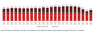 - En diciembre de 2018, Aguascalientes capital tenía un 54.6% de percepción social de inseguridad pública; en marzo del 2019, esa percepción aumentó a 58.1%