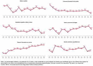 Con el propósito de proporcionar una medición periódica, amplia, integral y oportuna del tema de seguridad pública, el Instituto Nacional de Estadística y Geografía (Inegi) diseñó la Encuesta Nacional de Seguridad Pública Urbana (ENSU), la cual cuenta con una periodicidad trimestral y en la que se incluyen los siguientes conceptos relevantes: Sensación de inseguridad por temor al delito (percepción); Expectativa social sobre la tendencia del delito (percepción); Atestiguación de conductas delictivas o antisociales (conocimiento); Cambio de rutinas por temor a ser víctima del delito (experiencias); Percepción del desempeño de las policías Preventiva Municipal, Estatal, Federal, Gendarmería Nacional, Ejército y Marina como autoridades de seguridad pública; Conflictos y conductas antisociales (existencia); Desempeño gubernamental (percepción); Fuentes de consulta de Información sobre seguridad pública (experiencias).