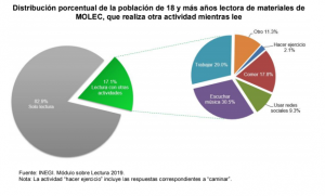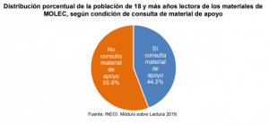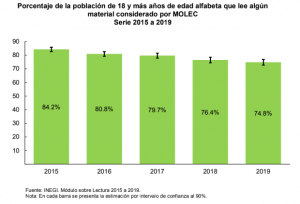 En febrero 2019 se realizó un levantamiento más del Módulo sobre Lectura (Molec), el cual tiene como objetivo generar información estadística sobre el comportamiento lector de la población de 18 y más años de edad que reside en áreas de 100 mil y más habitantes en México, con ello se busca conocer las principales características de la práctica de la lectura de la población adulta en el país y se proporcionan datos útiles que contribuyen a enfocar esfuerzos para su fomento.