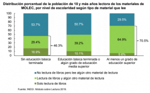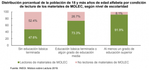 La condición de práctica de lectura se asocia positivamente con el nivel de escolaridad de la población; el porcentaje de población de 18 y más años de edad que lee algún material por los que se indaga en el Molec se incrementa conforme el nivel de estudios. El grupo que más declaró leer alguno de los materiales considerados en el módulo es el que cuenta con al menos un grado de educación superior, destacando que más del 90% de esta población es lectora ya sea de libros, revistas, periódicos, historietas o páginas de internet, foros o blogs.