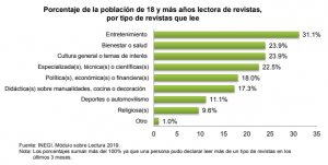 De la población lectora de revistas en los últimos tres meses, la temática que más declaró leer fue “entretenimiento” 31.1%, siguen los temas de “bienestar o salud” y “cultura general o temas de interés” con 23.9%; las revistas “Especializadas, técnica o científica“, representan 22.5% y se refiere a aquellas que dan a conocer progresos científicos, técnicos, pueden ser revistas de investigación de materias específicas, de divulgación científica o que contengan información en artículos o notas breves acerca de este tipo de temas.