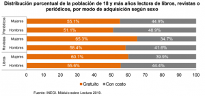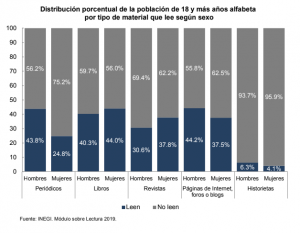 La lectura por tipo de material es diferencial por sexo, en 2019 se observa que 43.8% de los hombres declararon haber leído al menos un periódico la semana pasada, porcentaje muy superior a lo declarado por las mujeres (24.8 por ciento). Los hombres tienen mayor participación en la lectura de páginas de Internet, foros o blog, así como en historietas.