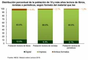 A pesar del incremento en el uso de las tecnologías de la información, se observa un gran predominio de la población de 18 y más años de edad lectora de libros, revistas o periódicos predomina aquélla que prefiere leer en formato impreso.