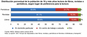 El lugar de preferencia para la lectura de libros, revistas y periódicos es el domicilio particular. Esto se relaciona con la relevancia del fomento a la lectura en el hogar, y es en este ámbito en el que la población se siente más cómoda para leer. Hay que destacar, sin embargo, el porcentaje de población que declara preferir la lectura de periódicos en el centro de trabajo o estudio.