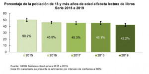 En cuanto a la lectura por tipo de material, en 2019 de cada cien personas, 42 declararon leer al menos un libro en los últimos doce meses; sobresale también la reducción de este porcentaje en relación con el dato del año 2015. Un dato de interés es el promedio de libros que leyó la población de 18 años y más en los últimos doces meses, el cual según resultado del Molec del 2019 es de 3.3 libros.