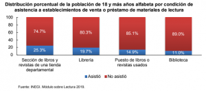 La asistencia a establecimientos de venta o préstamo de materiales de lectura, por la población de 18 y más años de edad alfabeta, es baja. Lo anterior, toda vez que 25.3% declararon acudir a la sección de libros y revistas de una tienda departamental. Respecto a una librería 19.7% indicaron haber asistido; 14.9% visitó un puesto de libros o revistas usados y el menor porcentaje lo registró la asistencia a una biblioteca.