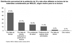 Del total de la población de 18 y más años de edad alfabeta que declaró no leer ningún tipo del material considerado por Molec, se identifica que las razones principales que señala para ello son principalmente falta de tiempo (47.9%), seguido por falta de interés (21.7 por ciento).