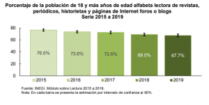 En cuanto a la lectura de materiales distintos a libros como son revistas, periódicos, historietas o páginas de Internet foros o blogs, los resultados del levantamiento más reciente señalan que 67.7% de la población alfabeta lee alguno de estos materiales; el descenso en la lectura de este tipo de materiales, que también presenta una disminución importante en relación con la cifra del año 2015