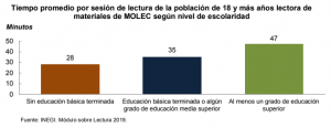 Se identifica que la duración promedio de la sesión de lectura es mayor conforme el nivel de escolaridad es más alto, de tal manera que las personas con al menos un grado de educación superior registraron un promedio de 47 minutos; por el contrario, las personas sin educación básica terminada, esto es, que no han concluido la educación secundaria, registran el menor tiempo promedio, con 28 minutos por sesión.