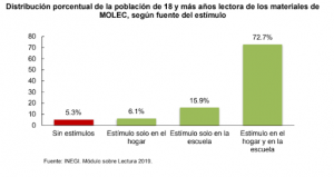 Respecto a estímulos en el hogar durante la infancia para la práctica de la lectura, 59.1% de la población de 18 y más años de edad alfabeta declaró haber tenido libros diferentes a los de texto en casa; la mitad veía a sus padres leer; al 33.5% les leían sus padres o tutores y el 27.1% de la población declaró que hubo fomento para la asistencia a bibliotecas o librerías.