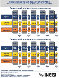 A partir del Índice base 100 dado por Inegi en el 2008, Aguascalientes, en 10 años ha crecido de 100 a 261 puntos; cuando el país ha desarrollado su 100 a 119 y la región no ha superado los 170 puntos. Lo anterior supone una gran expansión del comercio mayorista local que ha cobrado gran influencia regional hasta lograr multiplicarse.