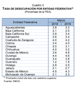 El Instituto Nacional de Estadística y Geografía (Inegi) dio a conocer los Indicadores de Ocupación y Empleo para marzo. Para marzo de este año, la tasa de desocupación en el estado se redujo 0.5% en comparación con el mismo mes de 2018. Aguascalientes presenta 3.3% de desocupación, en comparación con el mismo mes de 2018, que registró un porcentaje de 3.8% de personas desocupadas.