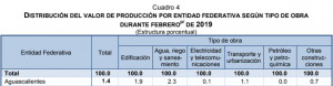 Aguascalientes representa el 1.4 por ciento del total del Valor de Producción en el país. En cuanto a la división por tipo de obra, lo relativo a la Edificación registra un 1.9 por ciento del total comprendido por las 32 entidades; Agua, riego y saneamiento, 2.3 por ciento; electricidad y telecomunicaciones, 0.1 por ciento y transporte y urbanización 1.1%. Otras construcciones representa el 0.7 por ciento.