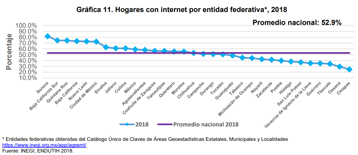 - El promedio nacional de hogares con cobertura de internet se ubica en 52.9%