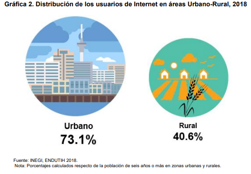 La relación de acceso a Internet por zona Urbano-Rural muestra una diferencia de 32.5 puntos porcentuales, ya que los resultados reflejan un 73.1% en las zonas urbanas y 40.6% en las rurales.