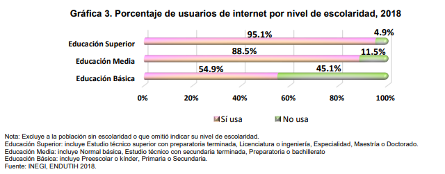 Con base en la información de la Endutih 2018, de aquellos que cuentan con estudios de nivel superior (licenciatura o posgrado), sólo un 4.9% no usa Internet. Los que cuentan con estudios de nivel medio superior (preparatoria o equivalente) representan un 11.5% y entre los que cuentan con estudios de nivel básico (primaria o secundaria), la cifra aumenta a un 45.1 por ciento.
