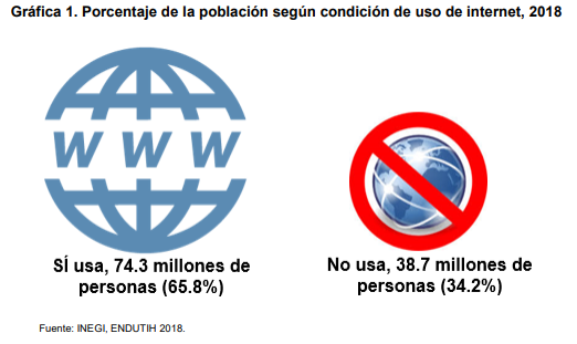Como se puede observar en la gráfica 1, de las personas encuestadas de seis años o más en el país en 2018, 74.3 millones declararon sí usar Internet (65.8% de la población). Esta cifra significa un avance de 1.9 por ciento respecto de los datos de 2017 (63.9 por ciento).