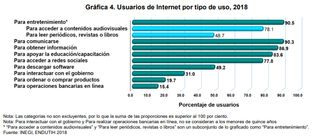 Las principales actividades realizadas en Internet durante 2018 son: Para entretenimiento (90.5%), Para comunicarse (90.3%) y Para obtener información (86.9%). Otras como Para apoyar la educación/capacitación y Acceder a contenidos audiovisuales, registran porcentajes del 83.6 y el 78.1%, respectivamente.