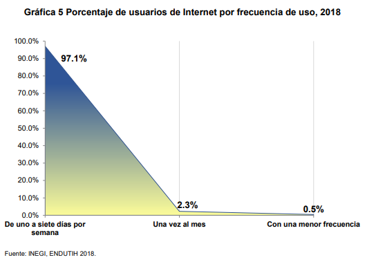 Para la población mexicana, el acceso a Internet se ha convertido en algo cotidiano y le acompaña en la mayoría de sus actividades, ya sea directa e indirectamente. Los usuarios recurrentes -aquellos que usan el Internet uno o más días por semana- representan el 97.1% del total de la población usuaria. Aunado a esto, tenemos también a los que la usan de manera mensual (2.3%) que, junto a aquellos que usan Internet uno o más días por semana, alcanzan una proporción del 99.4% (gráfica 5). Los usuarios con una menor frecuencia (menos de una vez al mes) representan el 0.5 por ciento.