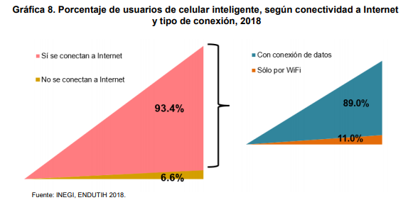El 89.0% de los que sí se conectan a Internet mediante un celular, lo hacen precisamente a través de la conexión de datos o conexión móvil, mientras que el 11.0% de los usuarios señala hacerlo sólo mediante WiFi.