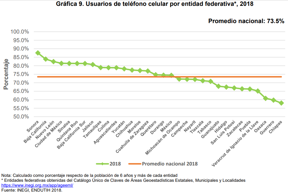 La telefonía celular es de las tecnologías con mayor penetración nacional, con las menores diferencias regionales y que suma un total de 83.1 millones de personas usuarias en el país. Para el caso del comportamiento a nivel entidad de este mismo indicador, se tiene que la diferencia entre las entidades extremas (con la mayor y la menor proporción respectivamente) es de 29.5 puntos.