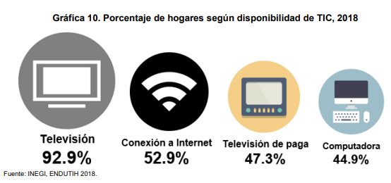 En la siguiente gráfica se puede apreciar que, en lo nacional, la mayoría de los hogares (92.9%) disponen de televisor. Por otro lado, también indica que en los hogares la disponibilidad de computadoras (44.9%) se mantuvo, mientras que la de los servicios de señal de televisión de paga (47.3%) disminuyó 2.2 puntos porcentuales respecto de 2017. Por el contrario, el Internet (52.9%) es cada vez más recurrente, ya que aumentó 2.0 puntos porcentuales respecto del año anterior.
