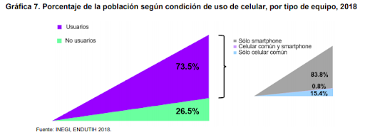 El 73.5% de la población objetivo indicó ser usuaria de teléfono celular (habilitado para hacer y recibir llamadas o mensajes). De ellos, un 83.8% cuenta con al menos un celular de los llamados “teléfonos inteligentes” o “Smartphone”; un 0.8% cuenta con al menos un celular común y un celular inteligente a la vez, y un 15.4% únicamente cuenta con al menos un celular común.