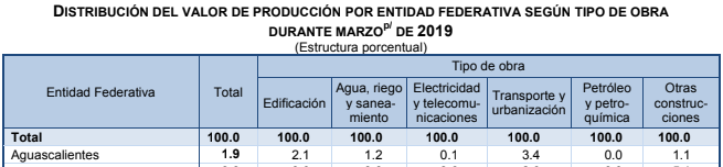 De acuerdo a cifras del Instituto, en cuanto a la distribución del valor de producción por entidad federativa según tipo de obra, Aguascalientes concentra el 2.1% relativo a la edificación. En cuanto a las obras para agua, riego y saneamiento, el estado concentra el 1.2% del total; en las obras de electricidad y telecomunicaciones el 0.1%, obras en transporte y urbanización el 3.4% y el 1.1% de otras construcciones.