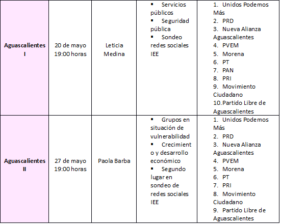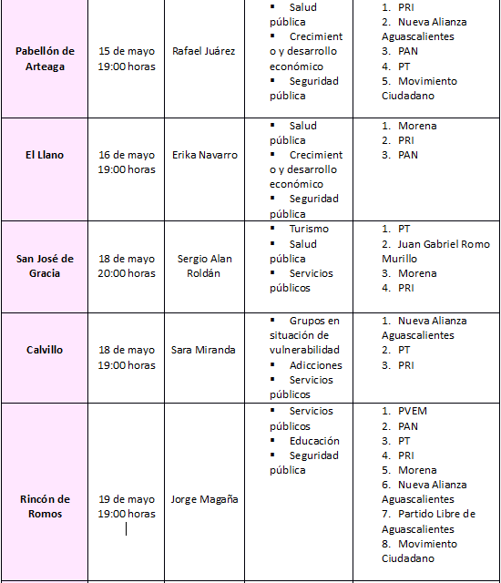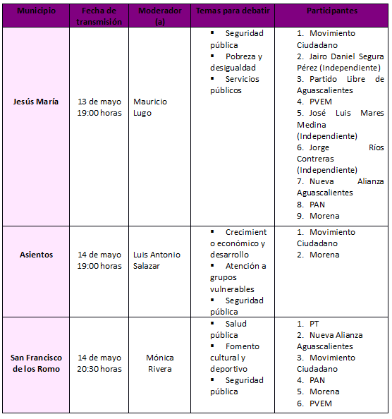 Los diez debates serán transmitidos del 13 al 27 de mayo por Canal 26 y a través de las redes sociales del IEE y Radio y Televisión de Aguascalientes (Ryta), que proporcionará la clave de la señal satelital para otros medios de comunicación que deseen transmitirlos.