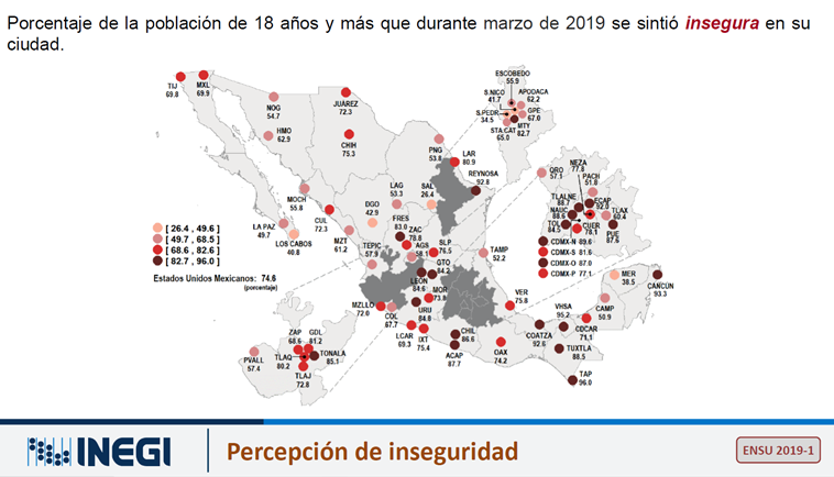 Las ciudades con mayor porcentaje de personas de 18 años y más que consideraron que vivir en su ciudad es inseguro fueron: Tapachula, Villahermosa, Cancún, Reynosa, Coatzacoalcos y Ecatepec de Morelos, con el 96%, 95.2%, 93.3%, 92.8%, 92.6% y 92%, respectivamente.
