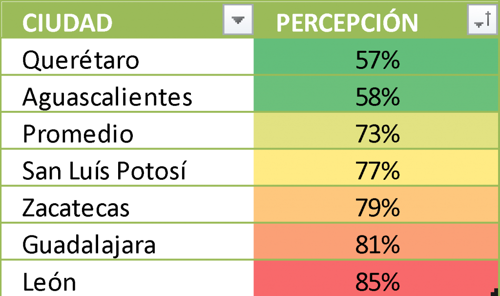 Por otro lado, las ciudades con menor percepción de inseguridad fueron: Saltillo, San Pedro Garza García, Mérida, Los Cabos, San Nicolás de los Garza y Durango, con 26.4%, 34.5%, 38.5%, 40.8%, 41.7% y 42.9%, respectivamente.