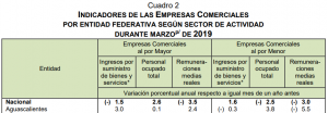 En cuanto a las empresas comerciales al por mayor, la entidad tuvo un incremento en los ingresos por suministro de bienes y servicios del 3 por ciento, comparando marzo de 2019 con el mismo mes de 2018; en este mismo periodo comparado, el personal ocupado en las empresas comerciales al por mayor aumentó 0.1 por ciento, en tanto las remuneraciones medias reales crecieron 2.4 por ciento.