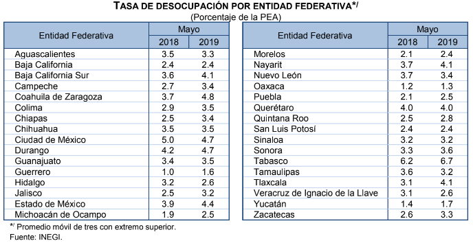 El Instituto Nacional de Estadística y Geografía dio a conocer Indicadores de Ocupación y Empleo para mayo de 2019.
