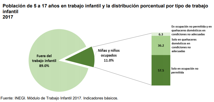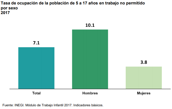 En 2017 el MTI estimó que 3.2 millones de niñas y niños de 5 a 17 años realizan actividades económicas no permitidas o quehaceres domésticos en condiciones no adecuadas. Esto significa una tasa de ocupación de 11.0% para el conjunto de la población infantil: 13.6% para los varones y 8.4% en mujeres.