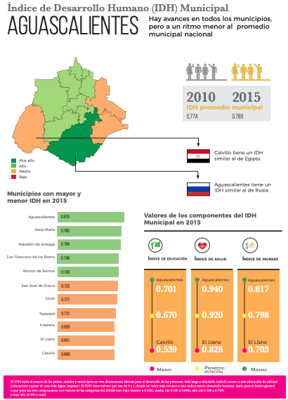 Si bien en Aguascalientes hay avances en todos los municipios, a pesar de las ventajas con las que el estado cuenta en cuanto a ubicación geográfica, este va en un ritmo menor al promedio municipal nacional, según señala el Índice de Desarrollo Humano (IDH) Municipal 2010-2015 realizado por el Programa Nacional de la Naciones Unidas para el Desarrollo. Mientras que en el 2010 el IDH promedio para la entidad fue de 0.774, en el 2015 fue de 0.789.