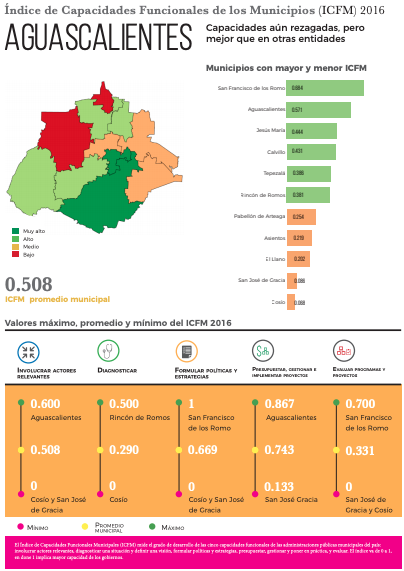 Aguascalientes presenta capacidades aún rezagadas, pero mejor que otras entidades del resto del país. Entre los municipios de mayor a menor ICFM, encabeza la lista San Francisco de los Romo (0.684), le sigue el municipio capital con (0.571), Jesús María (0.444), Calvillo (0.431), Tepezalá (0386), Rincón de Romos (0381), con índices altos; Pabellón de Arteaga (0.254), Asientos (0.219), El Llano (0.202) con niveles medios; San José de Gracia (0.086) y Cosío (0.068), con niveles bajos.