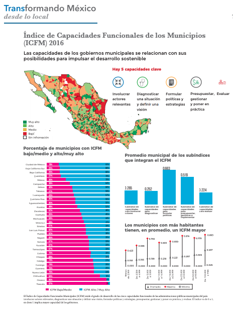 El Índice de Capacidades Funcionales Municipales (ICFM) mide el grado de desarrollo de las cinco capacidades funcionales de las administraciones públicas municipales del país: involucrar actores relevantes, diagnosticar una situación y definir una visión; formular políticas y estrategias, presupuestar, gestionar, poner en práctica, y evaluar. El índice va de 0 a 1, en donde 1 implica mayor capacidad de los gobiernos.