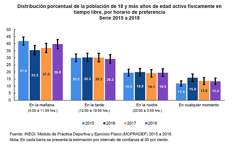La práctica del ejercicio resultó ser más común durante la mañana con el 39.8% por ciento. El horario vespertino fue la segunda opción con 29.3%, mientras que el 19.5 por ciento se ejercita por las noches; el 13.4 por ciento no tiene un horario específico para realizarlo.