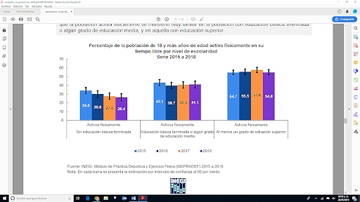 La encuesta también revela que, a mayor nivel de escolaridad, es mayor el porcentaje de la población que se activa. De la población sin educación básica terminada únicamente el 26.4% es activa y el 73.6 % es inactiva; en el grupo de entrevistados con al menos un grado de educación superior, el número de personas físicamente activas aumenta al 54.8%, por tanto, el de las personas inactivas se reduce a 45.2 por ciento.